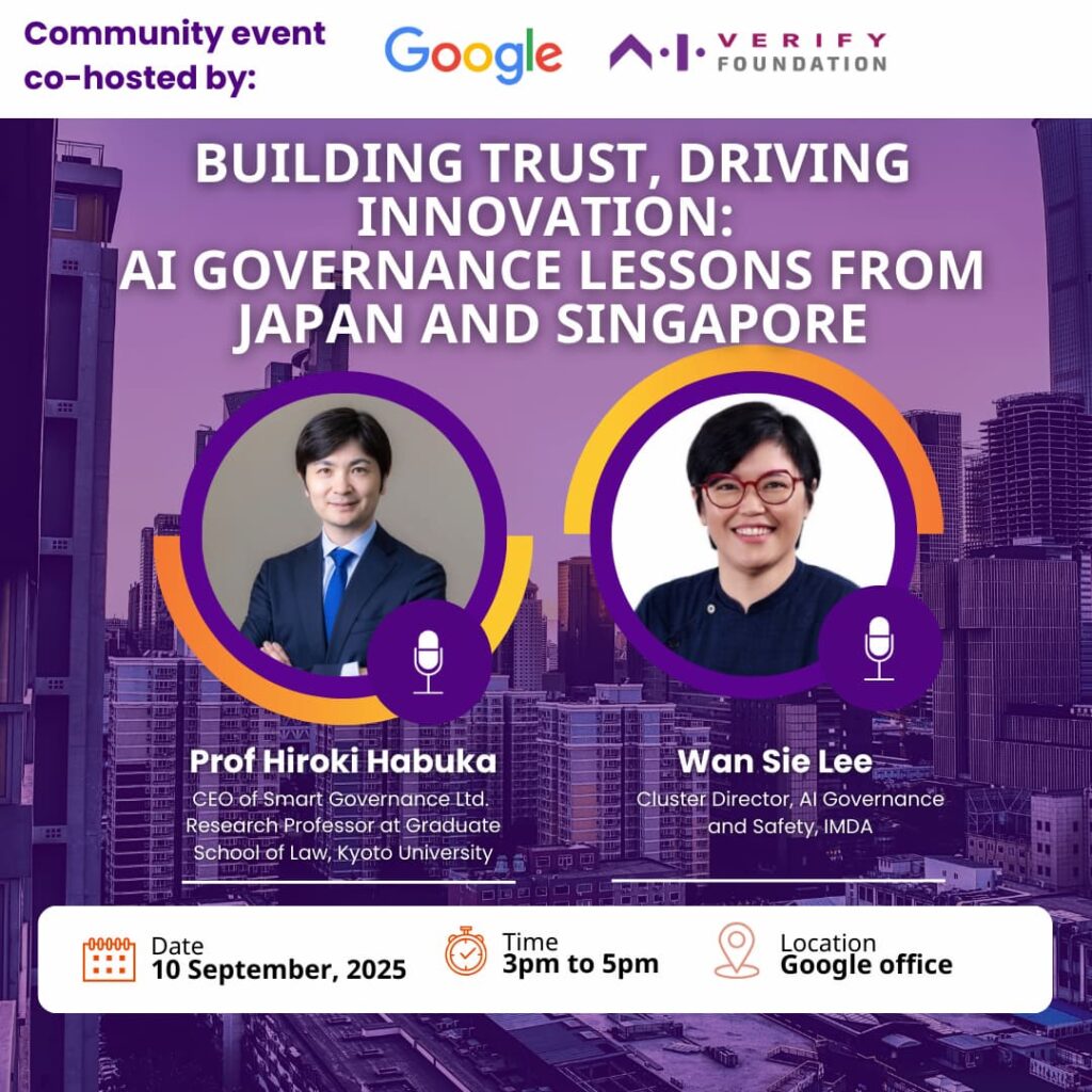 Japan and Singapore are carving distinct yet complementary paths in AI governance — both aimed at enabling trust and driving innovation across industries. On 10 September 2025, AIVF and Google hosted Prof Hiroki Habuka (Research Professor at the Graduate School of Law, Kyoto University, and the CEO of Smart Governance Ltd.) and Wan Sie Lee (Cluster Director, AI Governance and Safety, IMDA) at the Google office.